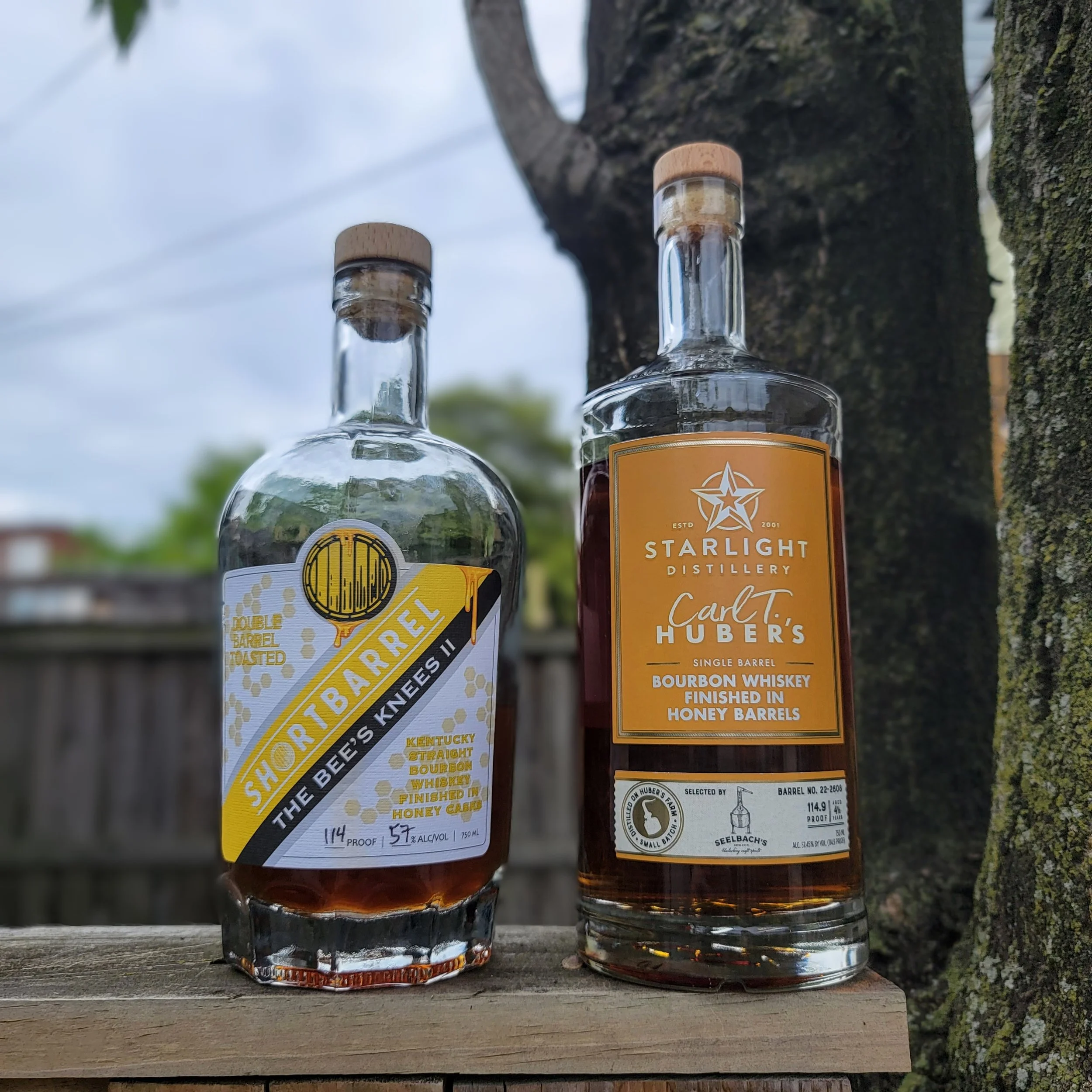 Two honey finished bourbons to review today! I love honey, absolutely love it, and as I’ve yet to try the holy grail of honey finishes- Belle Meade Honey Cask- I’ve got to make due with other, more available, offerings on the market. This brings us to Shortbarrel’s “The Bee’s Knees II” and Starlight’s Bourbon finished in Honey Barrels (Selected by Seelbach’s). Shortbarrel details their process in great length on the bottle and their website, but first they take a 50/50 blend of 4 year Bardstown Bourbon Company Bourbon and 5 year Green River Distillery Bourbon. Then, they add the blend back to four barrels (one medium toast, three heavy char) used by Atlanta’s Honey Next Door (which offers a bourbon barrel aged honey) where it's aged at least another 60 days. Those four barrels are THEN blended together for the final product.